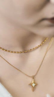 Turn everyday Glow into radiant balance with our Starlight Duo chain Pendant Necklace — a chic fusion of textures featuring a fluid snake chain paired with a glistening gold bead strand. At the center, a minimal star-shaped charm adds a modern celestial touch in a warm gold-tone finish. This dual-layered design gives effortless depth while keeping the look refined and wearable.