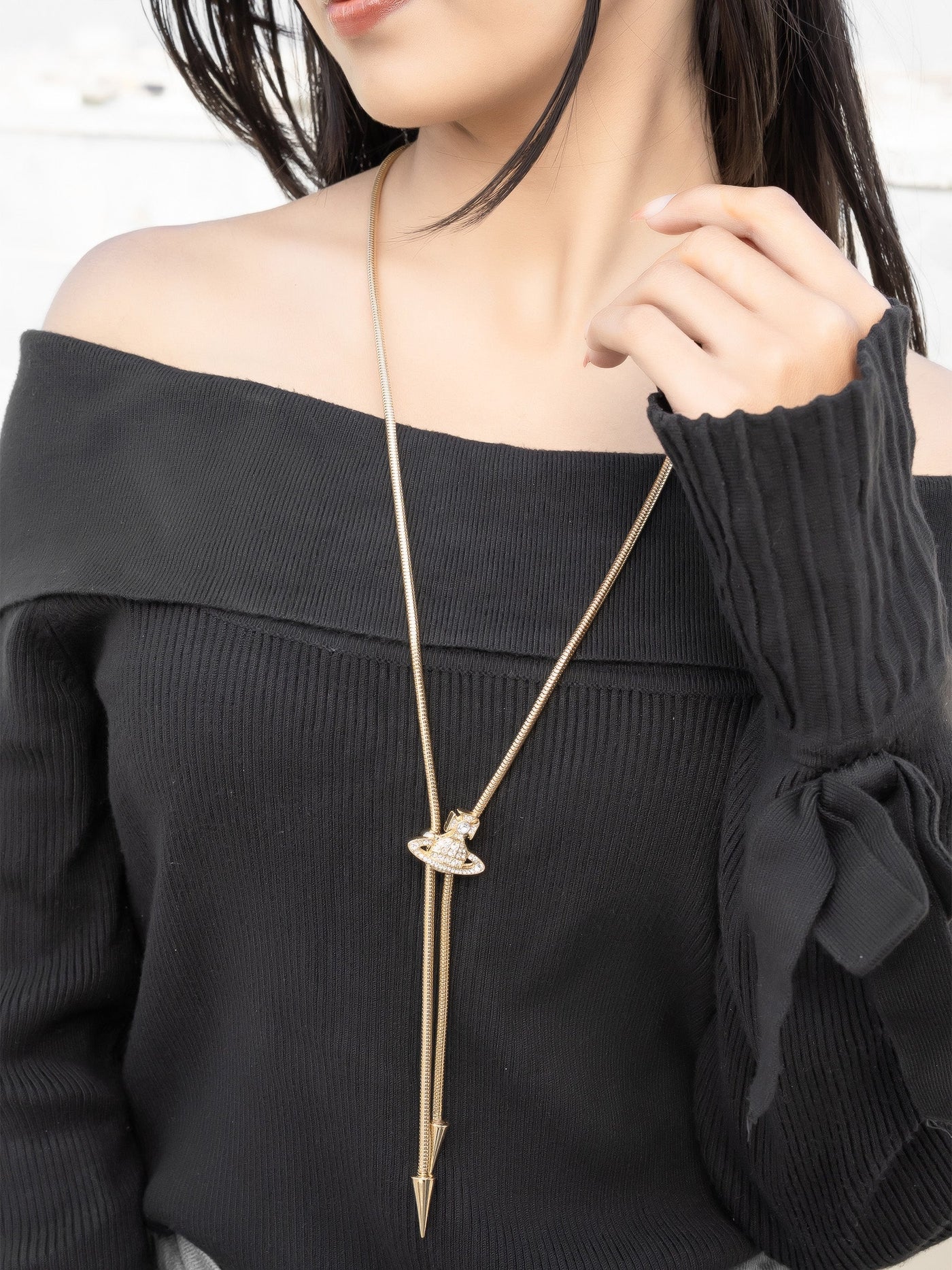Featuring a stunning planet-inspired centrepiece encrusted with shimmering stones, this long lariat chain drapes beautifully to elongate your neckline and elevate any outfit.