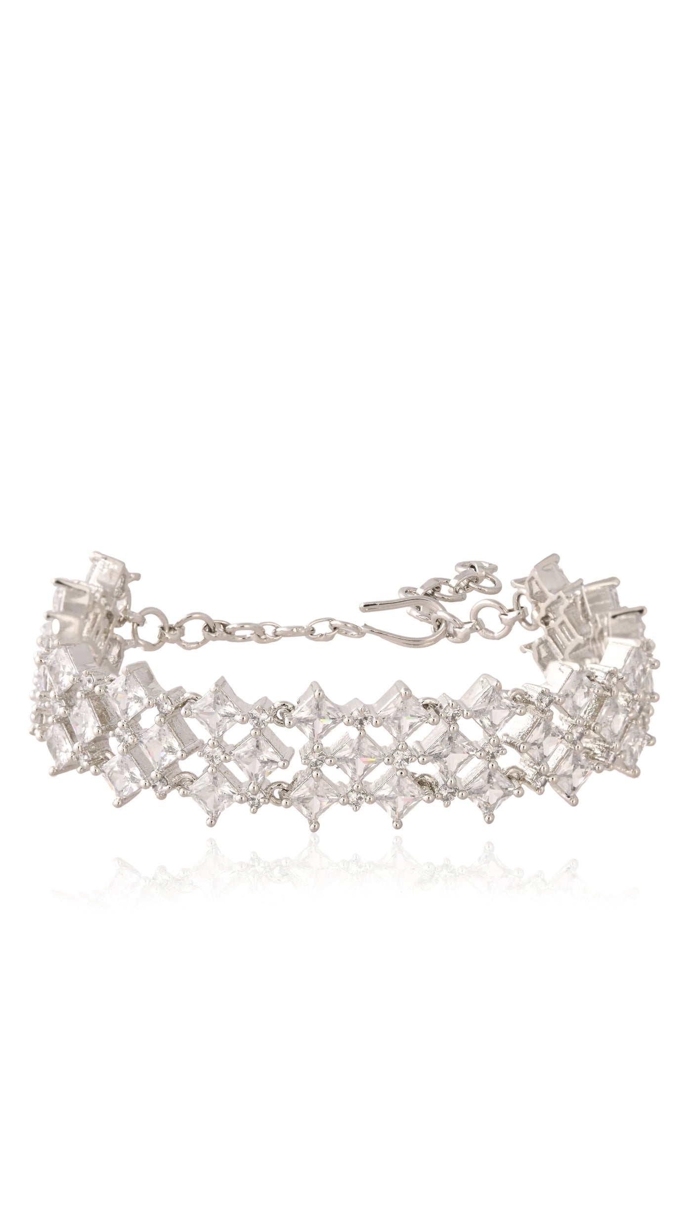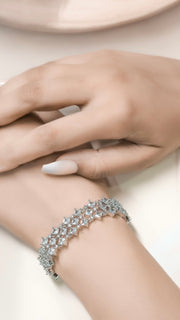 Like a night sky woven into silver, the Starlit Lattice bracelet dazzles with crisscrossed rows of square-cut crystals, each catching the light like a tiny star. The intricate lattice design gives it a luxurious, red-carpet feel while keeping an airy elegance that makes it just as perfect for cocktail parties as for glamorous soirées.