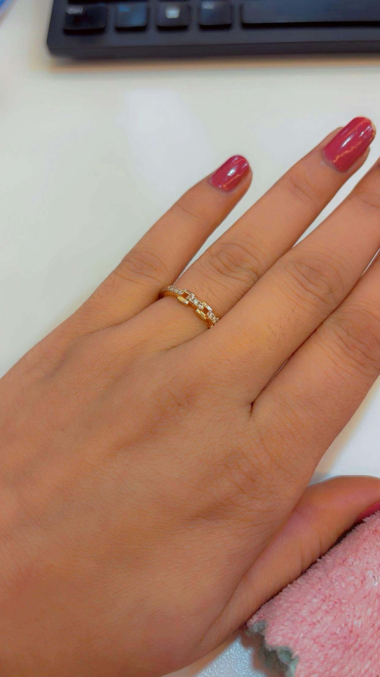 A graceful gold ring with a chain-link inspired design, dotted with sparkling stones that shimmer like reflections on Venice’s canals.